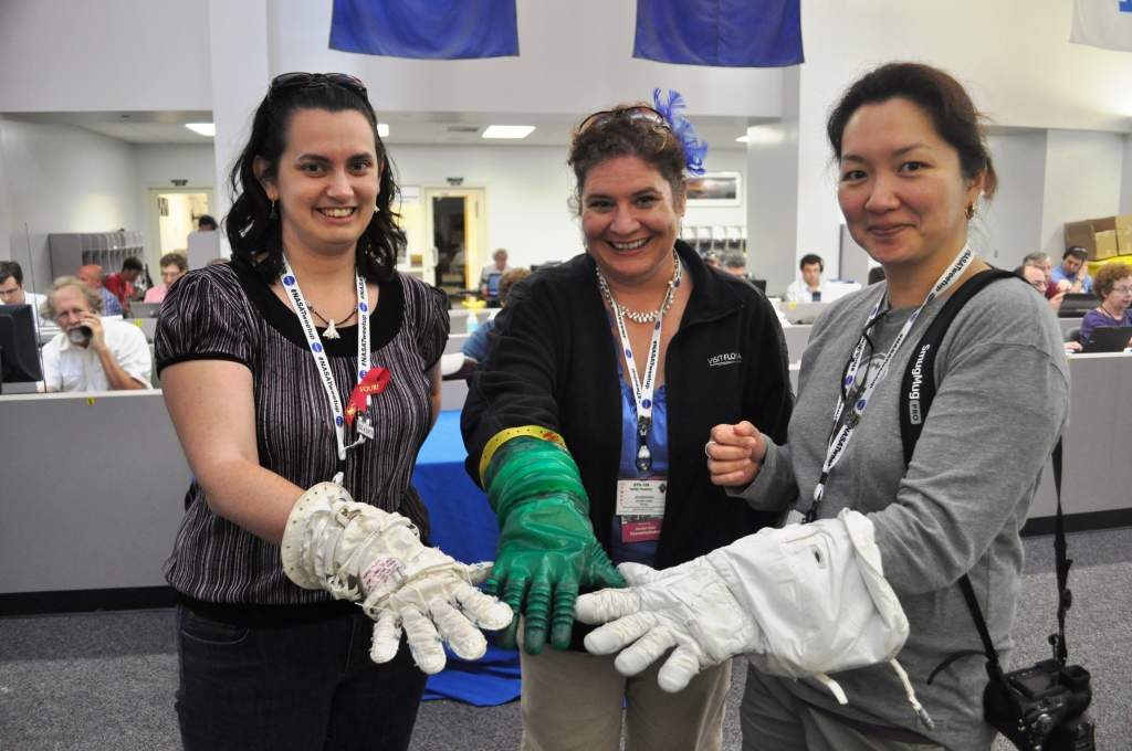 7:30 a.m.-ish NASATweetup attendee (and incredible photographer) Trey encouraged Linda, Jillian and I to visit the NASA press room. Before that, we had to stop and admire the newscaster next to us, Bill Hemmer of Fox who was chatting with Pia Carusone, Chief of Staff for Arizona Congresswoman Gabrielle Giffords, who is the wife of STS-134 Mission Commander Mark Kelly. Our visit to the press room was cut short when we spotted ABC’s Bob Woodruff. Sadly, we didn’t have the courage to speak with him.