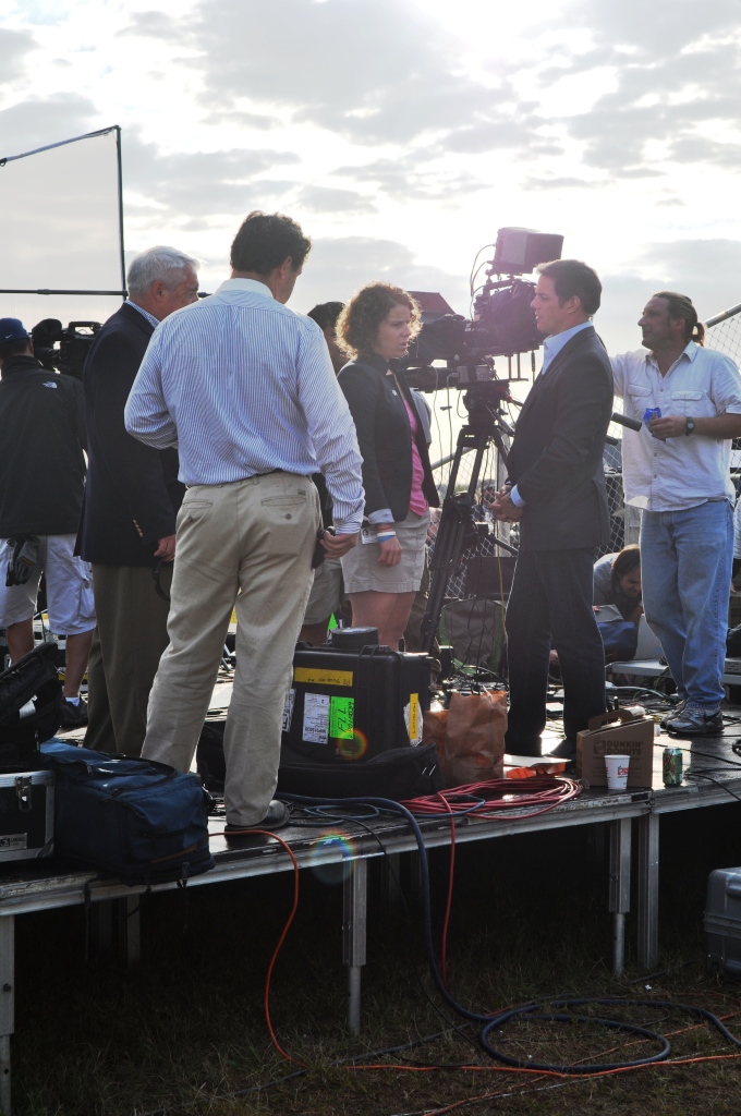 6:15 a.m. Headed to the bleachers which had groovy desks and electrical plugins to stay connected via computers and smart phones. Dew settled in and I unplugged my laptop in fear of some sort of electrical mishap. The top row was reserved for NPR. (How cool? I know!)