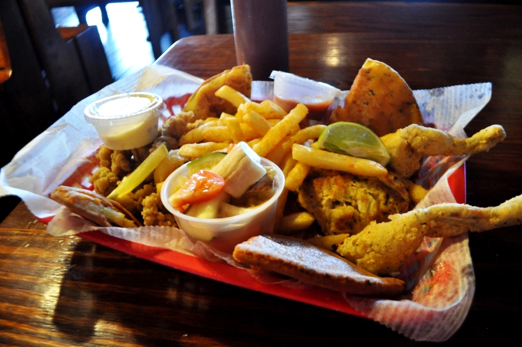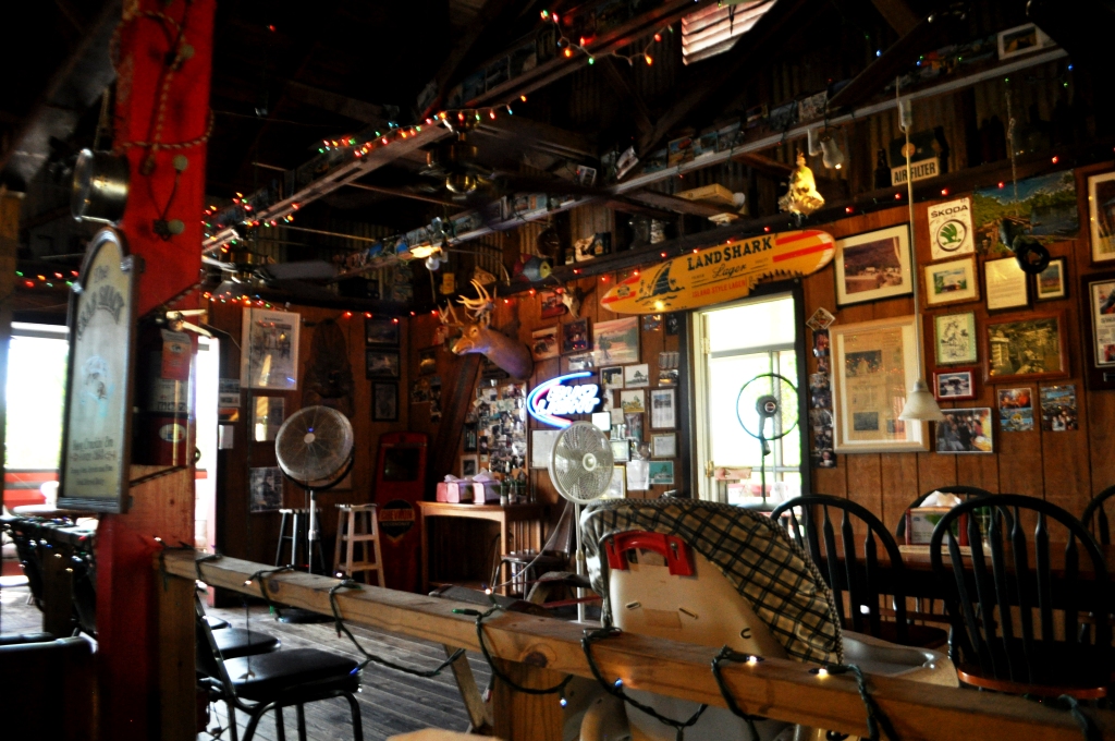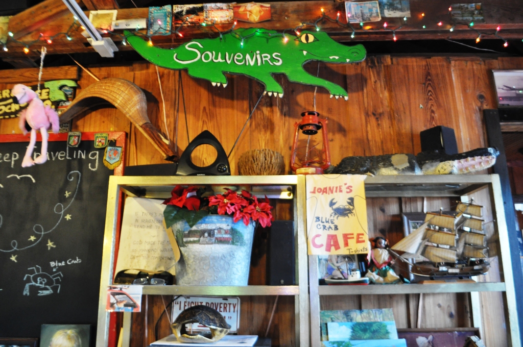 Inside Joanie’s Blue Crab Cafe is a trip! Postcards are tacked on the walls and wooden ceiling beams and fun signs and vintage artifacts which you’d probably find in grandma’s attic are mounted on the walls. I’m not sure how to describe the “art” dangling from the wood beams, other than it looks like someone at the restaurant passes the time with plastic bottles, paint and whatever random objects they can find during craft hour. Musicians play for diners beginning in the early afternoon.