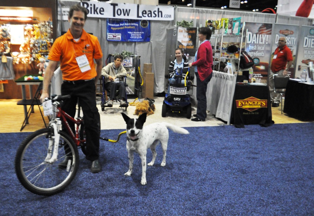 Recently, I met Mike Leon of Orlando, Fla., creator of Bike Tow Leash during Global Pet Expo in Orlando. I saw the device in action on a bicycle, wheelchair and a Scootaround Scooter and have to say, pretty nifty. [Sidebar: Global Pet Expo is the pet industry’s largest annual trade show.]