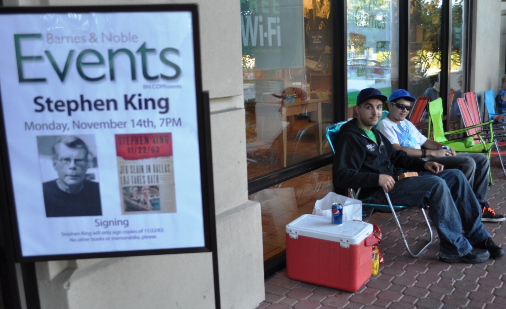 Are they King fans? Not really. A family member asked them to attend the event and the young entrepreneurs plan on selling the books. It’s their first time camping out for a book signing and they’ve come prepared with a cooler stocked with food. Once they pick up their wristbands at noon tomorrow, they can sneak away for a nap until the signing.