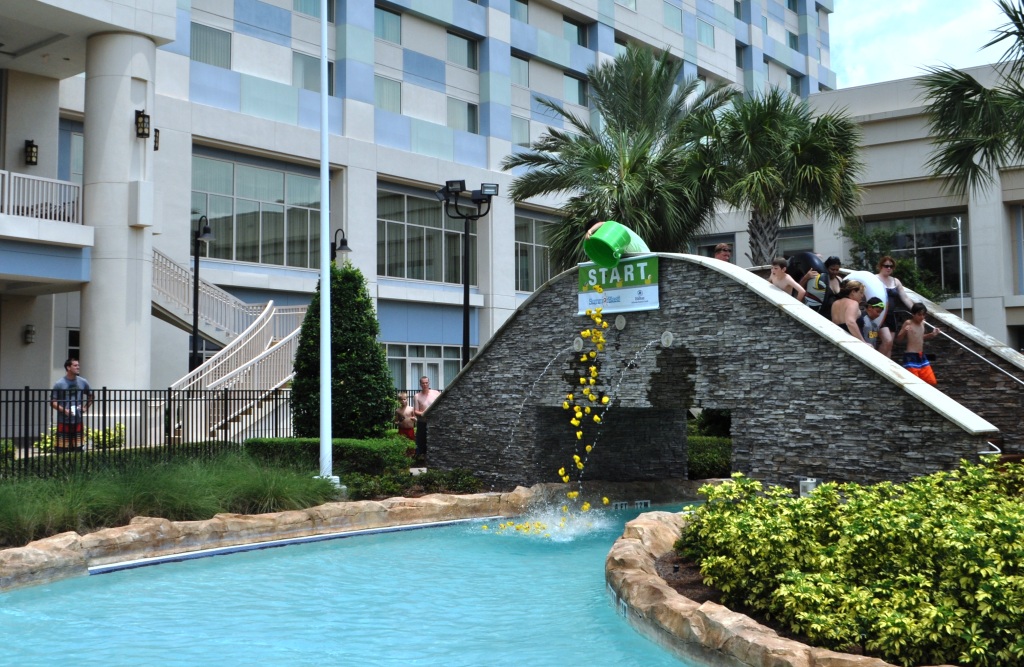 I must say, the visit really brought out the kid in me with no shame. My lunch ended just when the typical Florida downpour finished up and I moseyed out to the pool area for the Ducktona 500! Speaking of the pool area, a refreshing lazy river encompasses an island of relaxing, chilling and sunning. There’s a water slide into a pool along with a grille to grab a bite or refreshment. [Note: if visiting Florida between June and October, be aware afternoon rain showers are typical. Give it a few minutes then go out and play!]