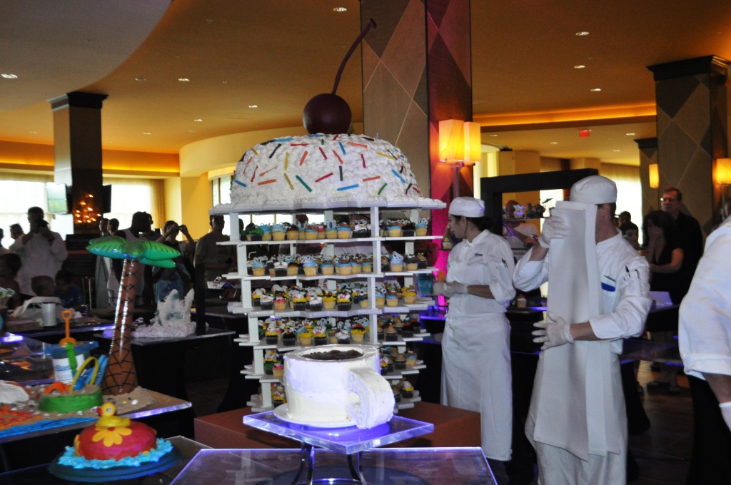 Later that afternoon was the Big Cupcake Reveal. When I say BIG, I mean a 7-foot-tall cupcake was rolled into the Hilton lobby and pastry chefs who baked and decorated 2,000 cupcakes in the week leading up to the weekend, stood by for the reveal. Guests crowded around the giant cake and after a series of birthday wishes to staff and guests celebrating another year, the over-sized paper cup was peeled away and 1,000 individually cupcakes were quickly pulled out and distributed to hungry visitors.
