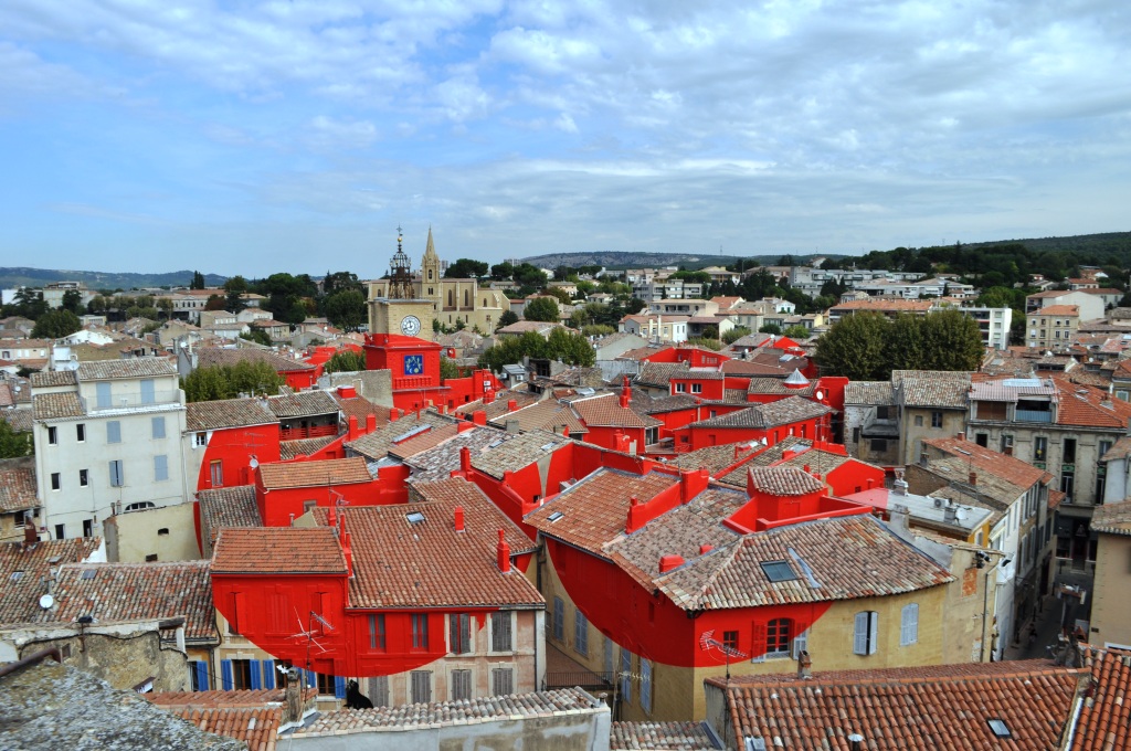 Inspiration for the Installation Can you say “WOW!”? The artist’s objective was to create a piece highlighting the typical rooftops of Salon-de-Provence. Red was selected because it’s the most suitable color for the city. Can you guess what the double discs represent? That’s right, it simulates the view of looking at the city through binoculars. If you have a chance to visit this lovely area of France be sure to notice the rooftops change color with the moving sun throughout the day.
