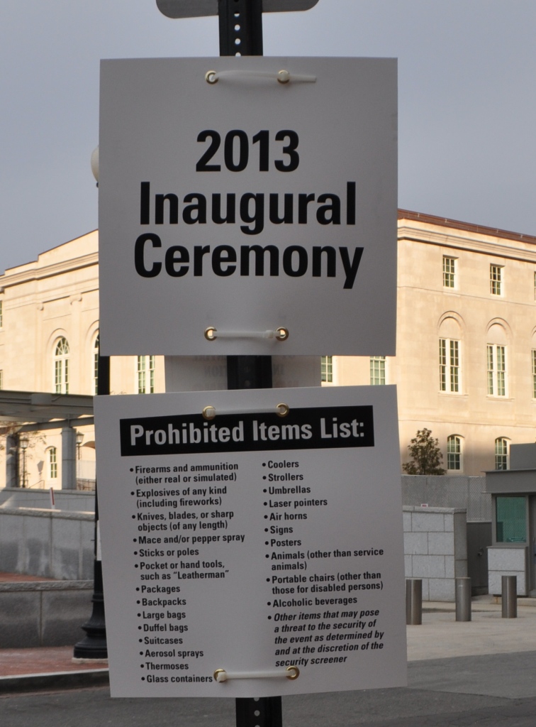 What makes me outraged is if my camera sans battery was a threat, why wasn’t it immediately placed into a bomb-proof box and contained? (Or maybe it was whisked away after I left.) And if all those other camera, insulated mugs and water bottles were threats, why weren’t they contained? I really hope those of you who attended the inauguration felt safer because I wasn’t allowed to bring in my camera.