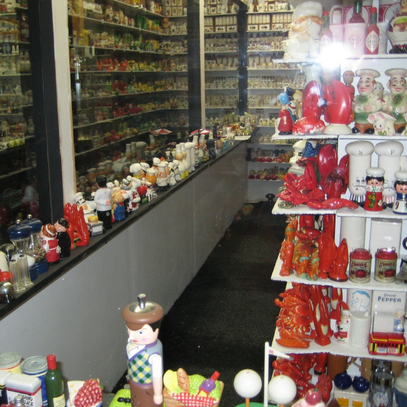 The personal salt and pepper shaker collection of Andrea Ludden outgrew her kitchen cupboards years ago so she opened the Salt and Pepper Shaker Museum to display more than 20,000 pair of condiment containers. Meticulously arranged by themes such as holidays, religion, and animals, the collection sits protected behind glass.