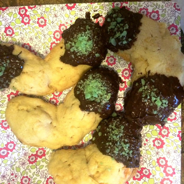 Once cool, melt dark chocolate chip cookies. (I popped them in the microwave on high for 1 minute.)