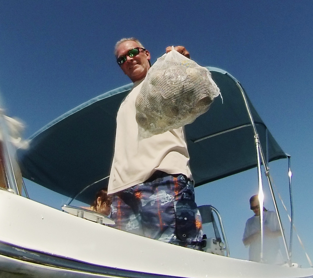 When Capt. Rick found the ideal scallop- scooping ground, he anchored the boat and let my three friends and me hop in and begin searching. The water temperature was just shy of 80 degrees and I’d guess it ranged from 3 to 4-feet deep.