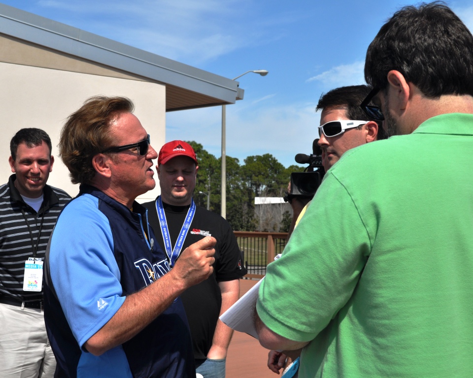 Wearing boot-cut blue jeans, a pair of Vans, a two-toned blue Rays jersey, dark shades and donning what some called auburn-colored hair at today’s pre-spring training press conference at the Charlotte Sports Park in Port Charlotte, Fla., there’s no doubt Tampa Bay Rays’ Manager Joe Maddon has some serious style. I’m no expert in fashion or baseball but over the past four years during Tampa Bay Rays Spring Training I’ve observed Mr. Maddon’s constantly evolving look.