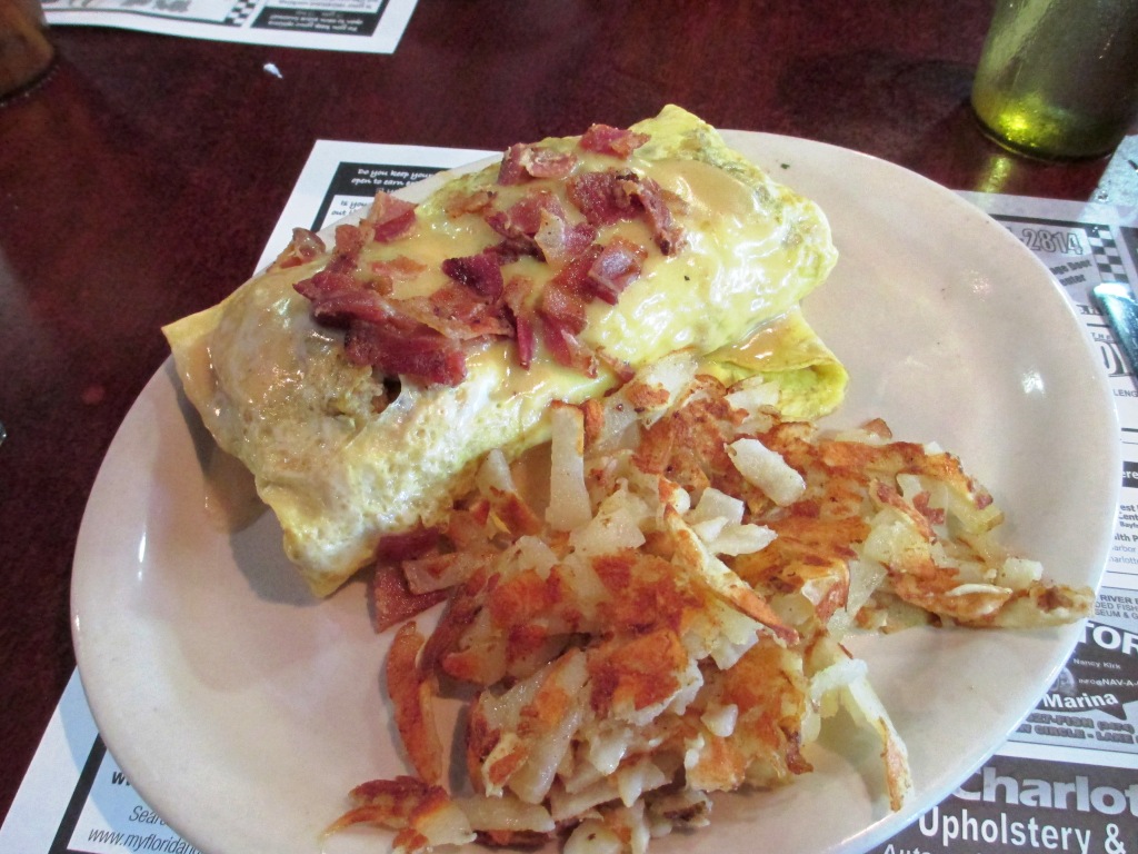 So what’s in the Thanksgiving Omelet? Three eggs, sliced turkey, sausage stuffing, mashed potatoes, cranberry Hollandaise sauce, and bacon bits. I ordered it with crispy home fries.
