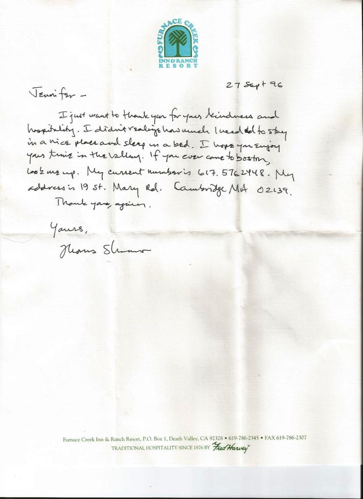 I’m a hopeless romantic, or just brainwashed by watching too many soap operas when growing up, and frequently wonder about “what if.” For instance, while going through some boxes of my past, I came across a letter written by a young hotel guest. He was handsome, dark-haired and probably in his late-20s. He was riding his bike through Death Valley on a cross-country journey. It was September and being sympathetic to his journey (and admiring the grueling trip he was making in the freakin’ Death Valley heat), I gave him a sweet rate on plush accommodations at the Furnace Creek Inn.