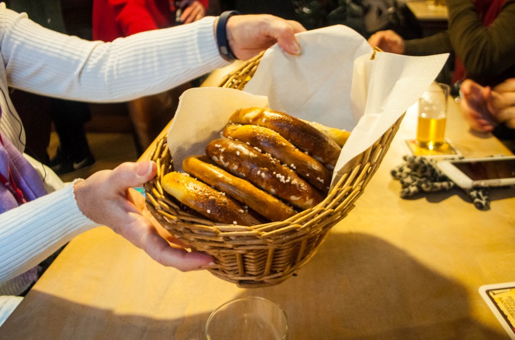 The beer sampling at Tavern Schlenkerla included tastes of a light blond beer, Hefeweizen (delicious wheat beer with a hint of citrus) and the rauchbier. A big, soft, luscious hot pretzel perfectly salted accompanied the tasting.
