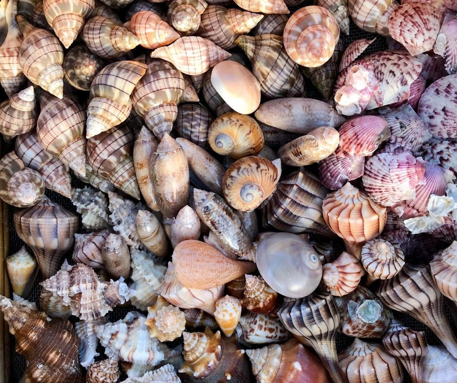 Others I gathered included banded tulips, lightning whelks, calico scallops, lettered olives, lace murex, shark eyes, and an Atlantic fig snail.