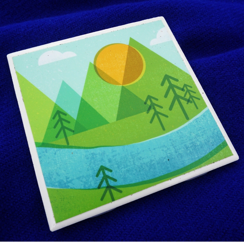 A ceramic coaster with an original-print mountain and stream scene from Robot Candy. The sunny scene reminds me of the wonderful memories I have from previous Portland visits.