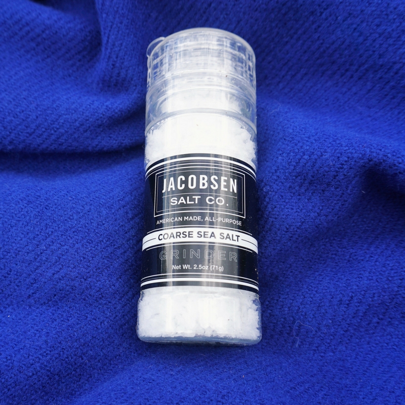 A bottle of coarse sea salt from Jacobsen Salt Co. The salt harvested from Netarts Bay on the Oregon Coast and the bottle has a sturdy grinder, perfect for grinding sea salt over my stove-cooked popcorn.