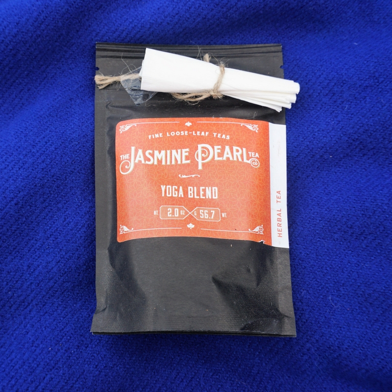 A bag of loose-leaf Yoga Blend tea from The Jasmine Pearls Tea Co. and empty tea bags to brew my tea. The herbal, fragrant and fruity tea is certified organic and perfect way to begin the day.
