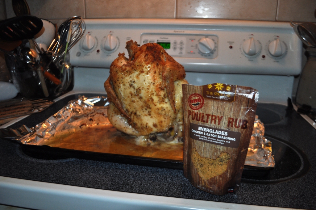 Beer can chicken with the Everglades Chicken and Gator Rub – I rubbed a whole chicken inside and out with the rub then improvised with the beer can part. I didn’t have a can of beer, but I had an empty can of Diet Coke and bottle of Angry Orchard’s Hard Cider. I rinsed out the can, poured in the cider, placed the chicken on the can and roasted it accordingly. Oh. My. Goodness. The chicken came out extremely tender, juicy and flavor beyond the skin (oh, the thin, crispy skin I shouldn’t be eating). It was a nice peppery, garlic flavor.
