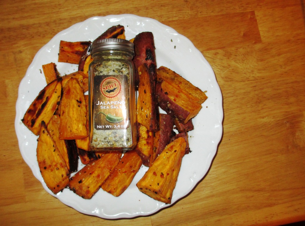 Sweet Potato Fries with the Jalapeno Sea Salt – I placed slices of sweet potatoes in a zip-top storage bag, poured in a little olive oil and sprinkled in the sea salt. Wow! This salt has a nice peppery bite.