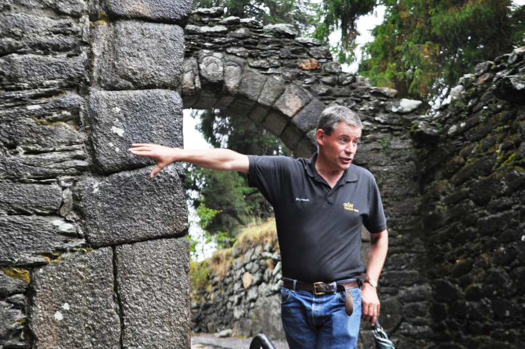 Glendalough is a tranquil 6th century Monastic Site about 51 km ( 31 miles) south of Dublin. I could easily see why this is one of Ireland’s most visited areas. Denis led the group through the cemetery, explained the significance of the round tour (the door was high enough for a ladder so the occupants could secure themselves inside, pull up the ladder and avoid the Vikings at least for a little while) and walked through what remains of the abbey.