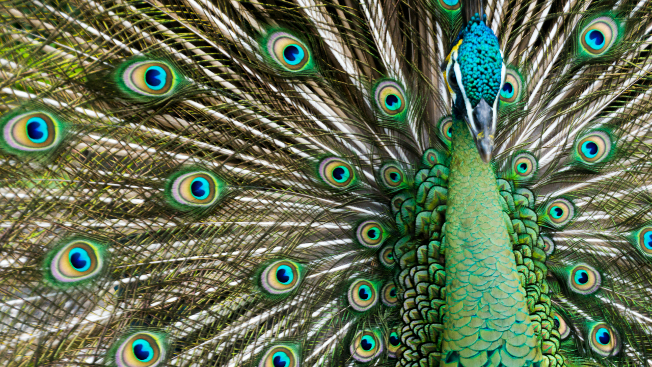 A stunning peacock strutted near the pond, showing off his plumage. I tossed him a few bits of feed which drew the attention of an ibis. As the ibis grew closer to the peacock, the peacock shimmied his plumage which made a light rustling sound, almost like a breeze passing through leaves in a tree and the motion kept the ibis away.