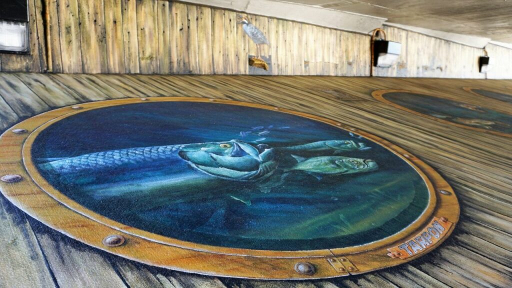 “Tails from the Harbor,” a mural celebrating Charlotte Harbor’s marine life of past and present, was painted by artist Skip Dyrda and dedicated June 20, 2019. Located under the Gilchrist Bridge (southbound U.S. 41) by Hurricane Charley’s (restaurant and bar), the artwork depicts various windows peering into Charlotte Harbor and spills onto the sidewalk.