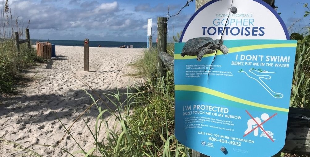 Admire gopher tortoises from a distance and DO NOT touch them, it is illegal to do so. UNLESS, there is a gopher tortoise in the road. In this case, the Florida Fish & Wildlife Conservation Commission (FWC) grants permission to pick it up and move it in the same direction it is headed and off the road. And please drive cautiously through areas that have gopher tortoise crossing signs.