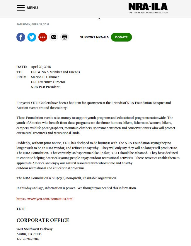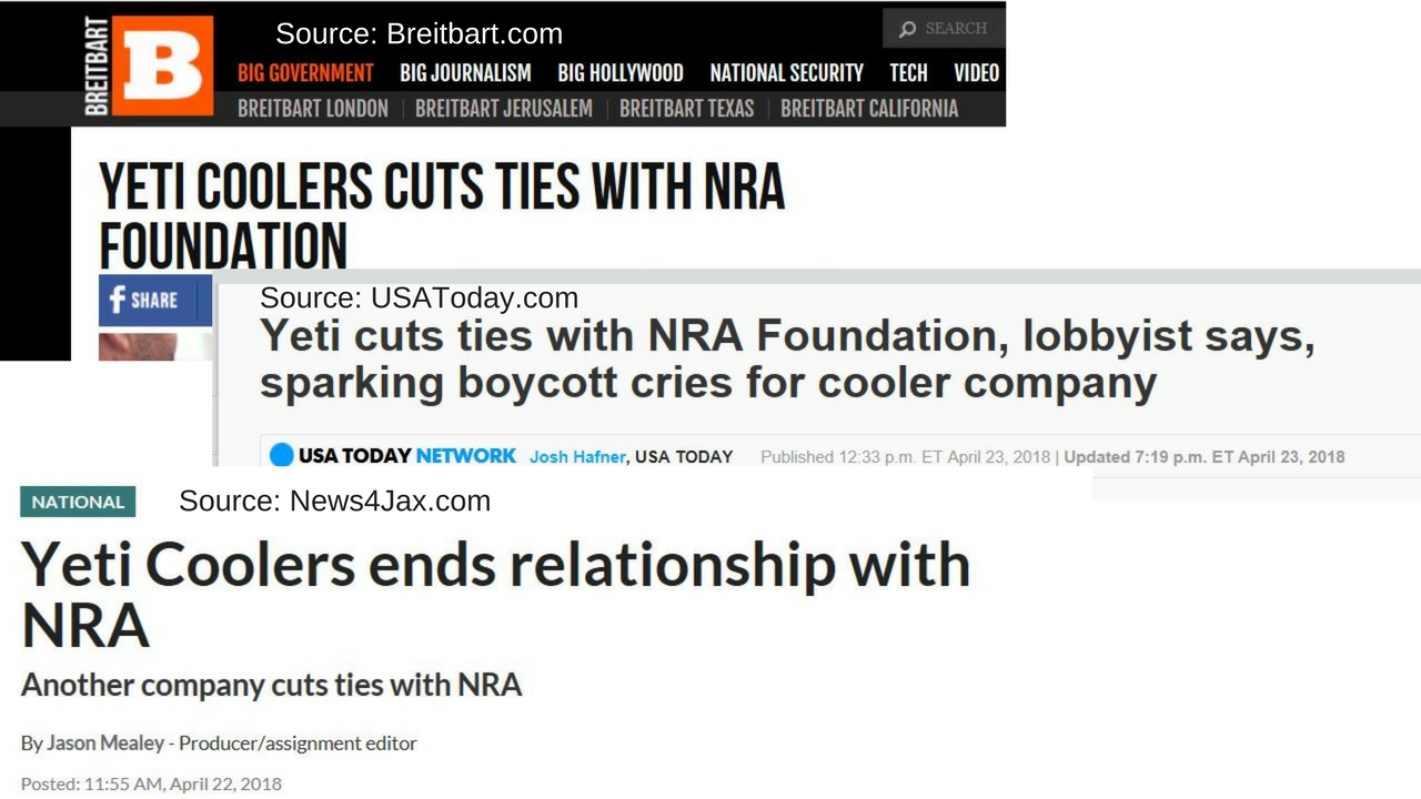Friday, April 20, 2018, National Rifle Association Institute for Legislative Action (NRA-ILA; the lobbying arm of the NRA), issued a press release tossing social media into a tizzy and generating fake news. Titled “Florida Alert: YETI Drops NRA Foundation” and issued from Marion P. Hammer, USF Executive Director and NRA Past President, the release stated (and posted online Saturday, April 21):