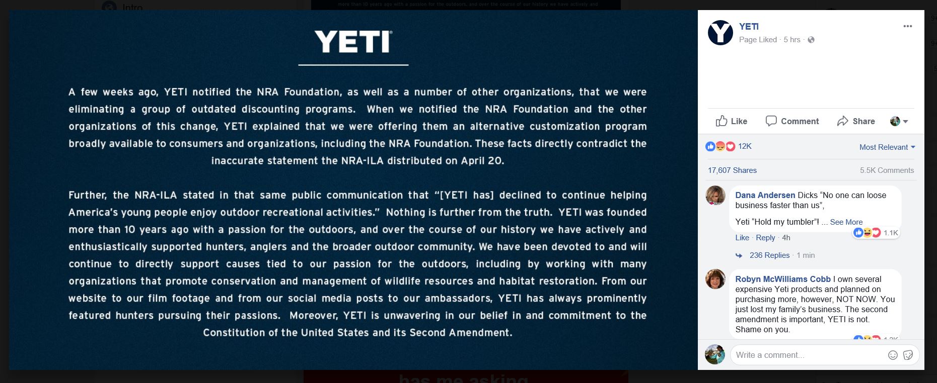 The outdoor community turned on the brand over the weekend and it wasn’t until later in the day on Monday, April 23, did YETI make a statement on Facebook: