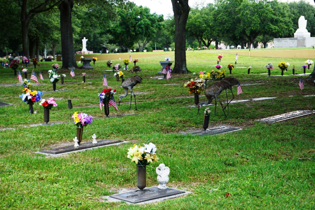 I watched the two adult and two juvenile cranes strut to vases and dip their beaks in and drink the water. Sometimes two at a time would have their beaks in a vase while the other two watched on. I followed them for several yards when I looked down and saw my grandfather’s headstone.