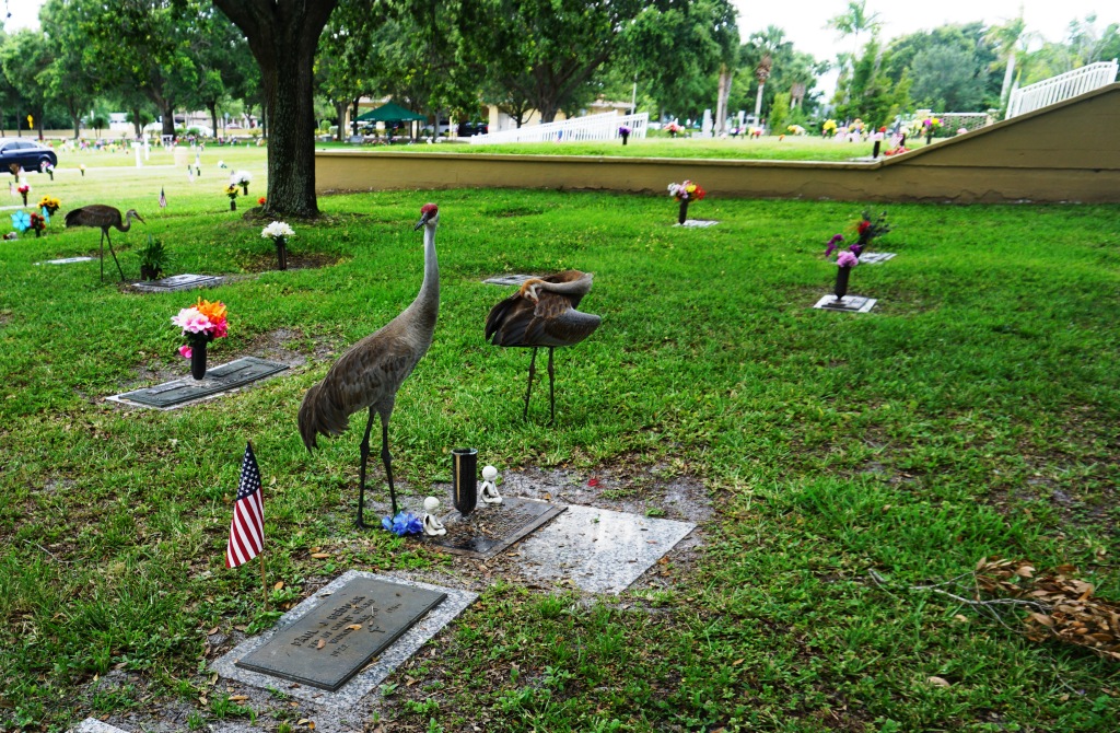 A family of four sandhill cranes were strutting about and I half-jokingly said, “Okay cranes, are you going to lead me to his grave?”