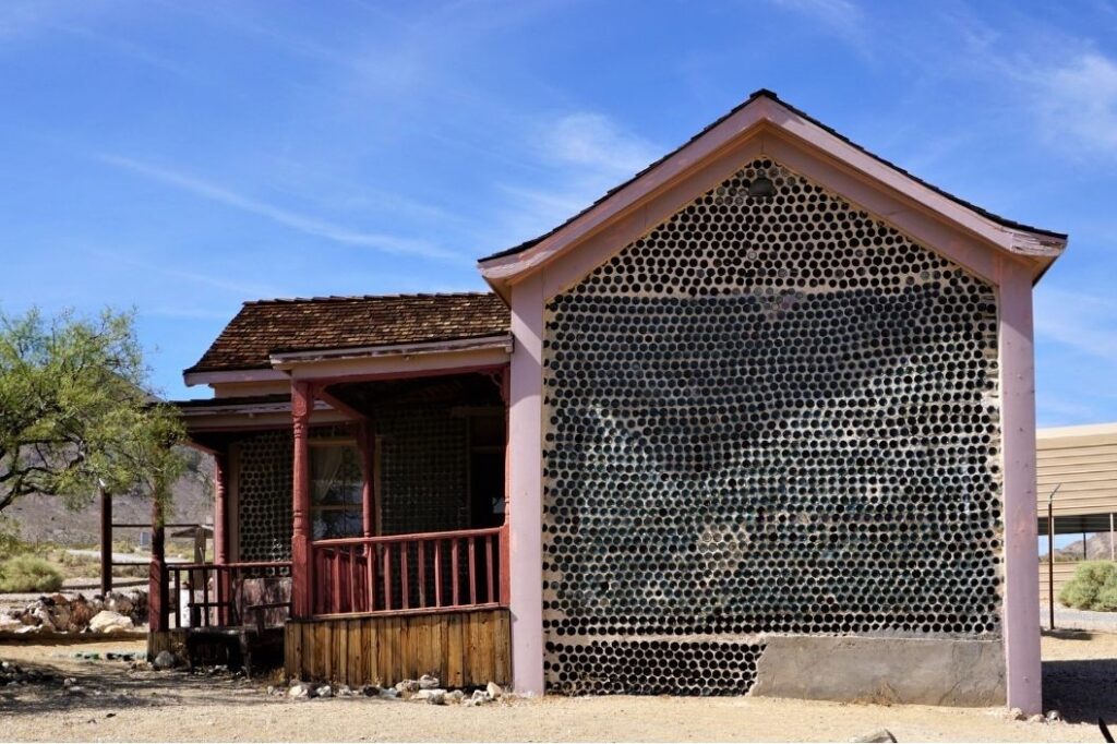 - Tom Kelly’s Bottle House – Rhyolite had 50 saloons in 1905 and Kelly collected about 50,000 bottles and cemented them with mud to build this three-bedroom house!