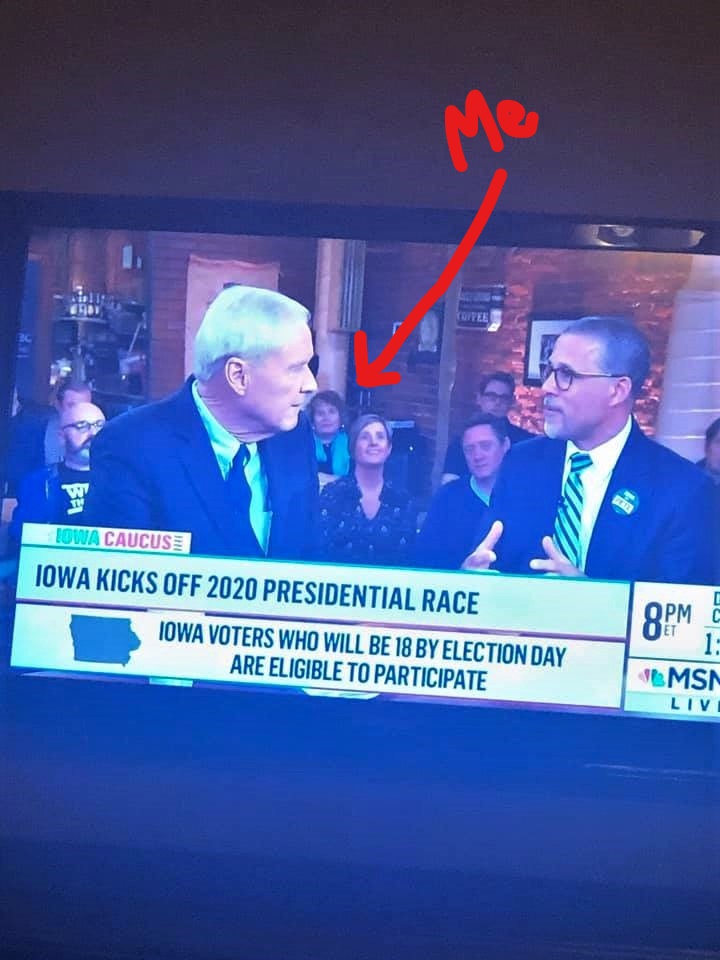 I also got on camera and contacted my family so they could see me in the background with my blue pashmina. Can you see me in the photo above? After the segment, it was time to bounce to the caucus experience but before leaving, Matthews posed for a selfie with me.