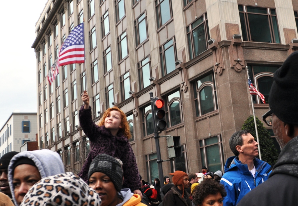 In all my frustration, while leaving the swearing-in ceremony in an attempt to find a Metro or something to eat, I looked up to see this pretty redheaded girl (pictured above) watching her American flag dance in the breeze. She swished her flag back and forth while wearing a charming little smile. Who knows if she’ll remember this day when she’s old enough to vote but kudos to her family for letting her experience Obama’s inauguration.