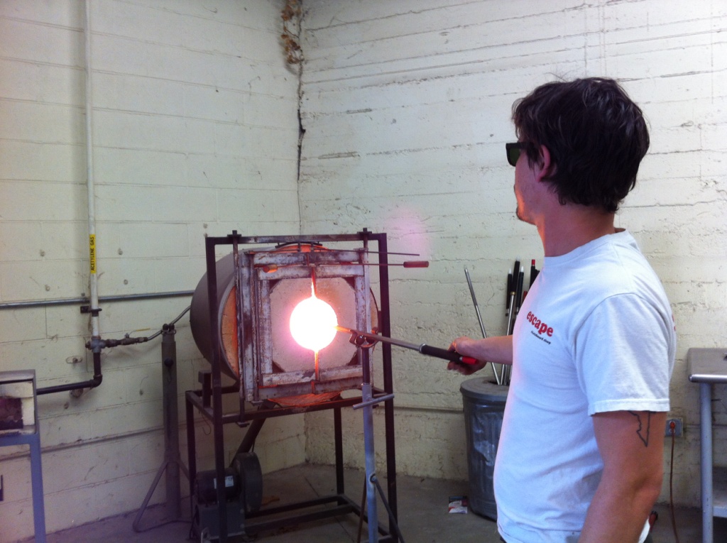 Watching him maneuver was like watching a graceful dance performance. Taking the blowpipe, Mr. Hendrick dipped it a furnace and pulled out what looked like an orange, glowing cotton swab tip. It was the glass in liquid form, ready to be crafted. I was mesmerized watching him glide from furnace to a metal counter to another furnace while molding and forming the glowing glob into a piece of beautiful art.
