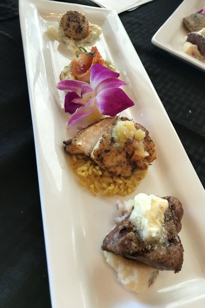 Beautifully presented were samplings of Thai-inspired shrimp with sriracha chili sauce atop creamy parmesan risotto, blackened redfish with pineapple salsa atop rice, a seared scallop with roasted tomato on chive truffle risotto, and New York strip with gorgonzola butter atop garlic mashed potatoes.