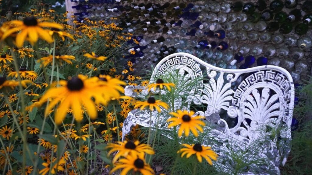 The interior is decorated with a combination of antiques and artwork, much of it created by the former homeowner, the late artist Susie Schmidhammer, older sister and business partner of Ms. Seabrook. The farm’s grounds are sprinkled with colorful flowers and more art, much of it made by repurposing materials that some people consider trash, like old or broken dishes and glass.