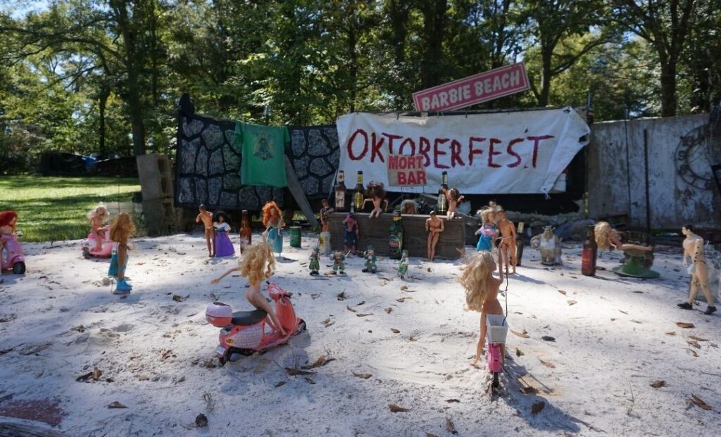 I recently participated in The Gold Ticket Treasure Hunt in Georgia. and as I drove the backroads, I stopped at a quirky yet kitsch thing to see, Barbie Beach! Barbie, GI Joe, and friends are engaged in a wild Oktoberfest celebration in Mort Bar on a lawn along Georgia State Route 16. Nearby, another team of Barbies was ready for kickoff between the Georgia Bulldogs and Auburn Tigers.