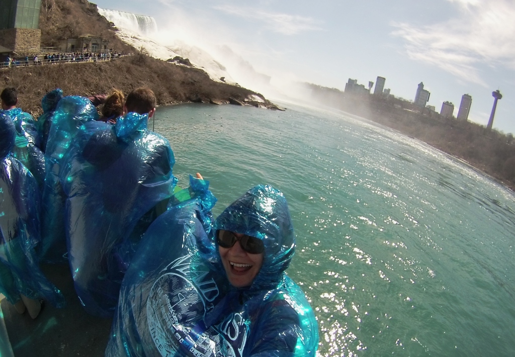 Had it been summer, I’m sure we would not have been able to walk up to the ticket booth and wait a few minutes before boarding a boat like we did. We were given stunning, transparent blue rain ponchos, which I suppose were optional, and kept us mostly dry from the mist of Niagara Falls. We staked our claim on the top of the boat but I imagine anywhere would provide the same view. Of course, being on top meant optimal wetness because as the boat neared the American Falls then Bridal Veil Falls things got a little moist. It wasn’t a drenching situation until we reached the Horseshoe Falls, which is on the Canadian side.